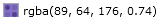 The advanced color picker uses RBG values to define the color, as well as an A (Alpha) setting to specify the transparency of the color in the range of 0–100, where 0 is transparent and 100 is solid. When the alpha setting is anything other than 100, the color is defined in the format