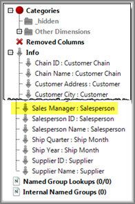 The display format is <Lookup Dimension>:<Core Dimension>. When you open this DivePlan in ProDiver, you see the Sales Manager: Salesperson value in the Info category of the console.