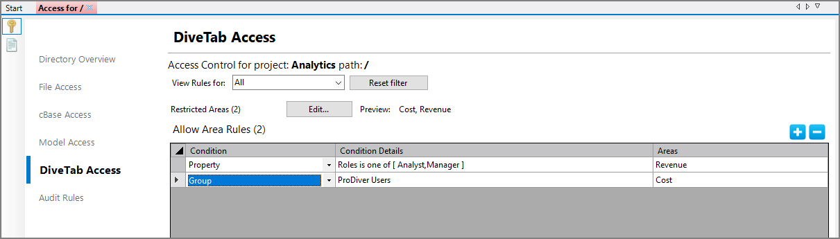 The DiveTab Access sub-tab of the access tab allows you to set Area access rules for your Workbench DiveTab project.
