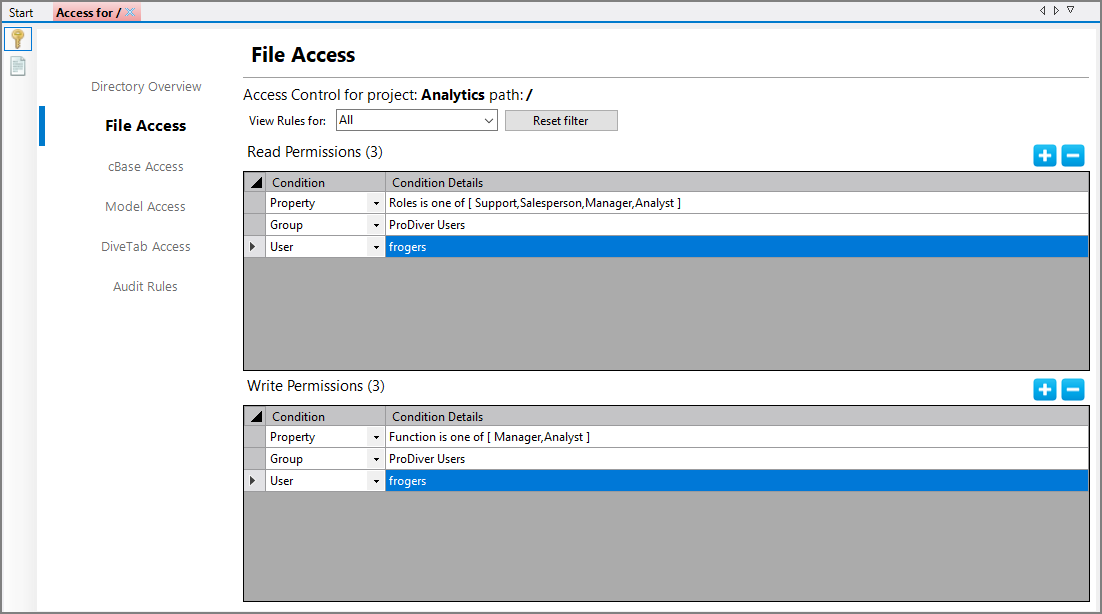 NOTE: Setting read and write permissions at the project level gives users access to all directories in the project. Then, you need to remove read access to any directories in the project that you do not want a user to see. This limits what appears in the ProDiver Open dialog box.