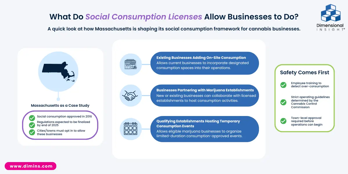 Massachusetts offers a good example for what companies looking to expand their businesses might need to know. Social consumption was part of the ballot measure legalizing marijuana in Massachusetts in 2016, but the state’s Cannabis Control Commission is finally planning to vote before the end of 2025 on the regulations that would allow for business owners to apply for licenses.