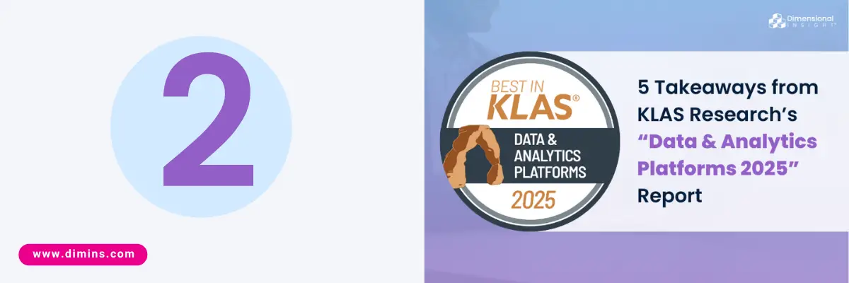 Dimensional Insight was recognized as a leader across key areas in the KLAS Research “Data & Analytics Platforms 2025” report. This blog post features five takeaways from the report, which sheds important light on the challenges healthcare organizations face when trying to turn their data into actionable insights.