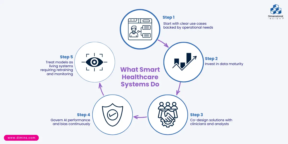 1. Start with clear use cases backed by operational needs (e.g., targeted readmission reduction, workforce planning).