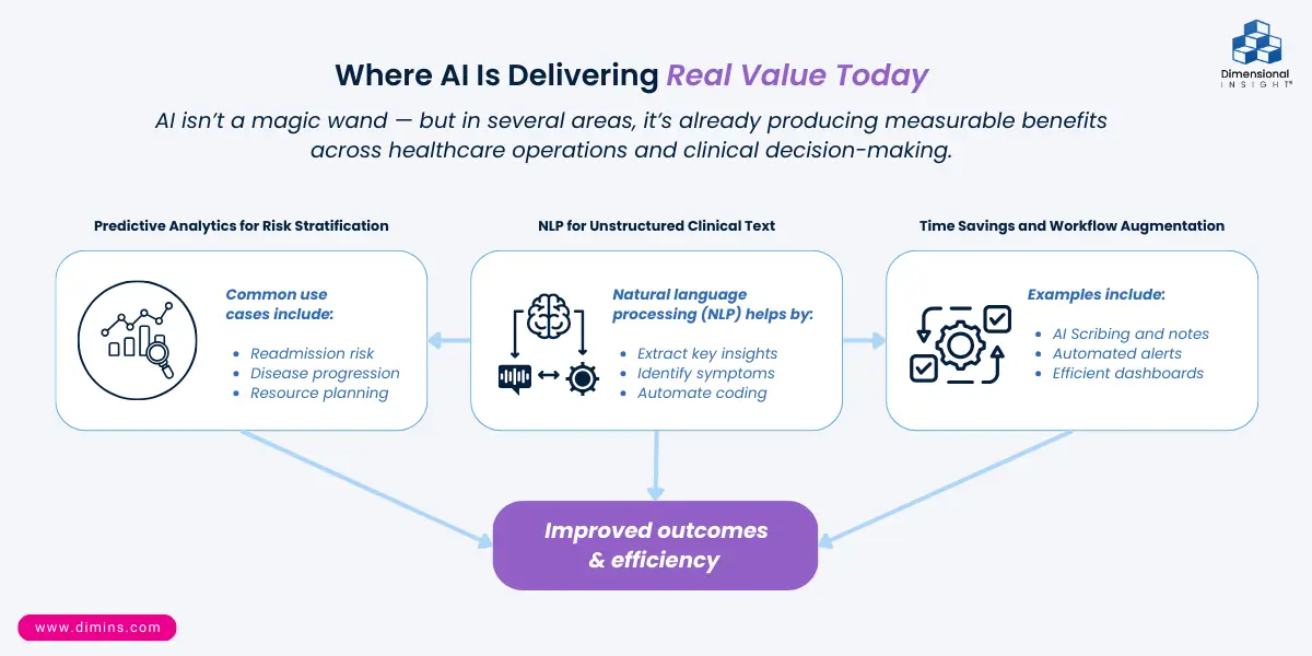 In real clinical and operational environments, the value of AI shows up clearly in well-defined use cases like predictive risk scoring and natural language processing (NLP) — yet the technology also has real limits that healthcare organizations need to understand before they invest. This post breaks down where AI is genuinely helping health systems, where the hype still outpaces reality, and how pragmatic healthcare analytics teams can make smart, measurable decisions about AI adoption.