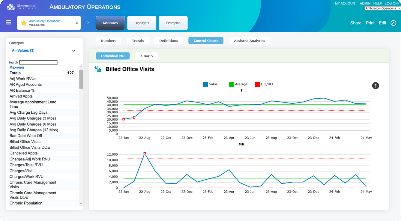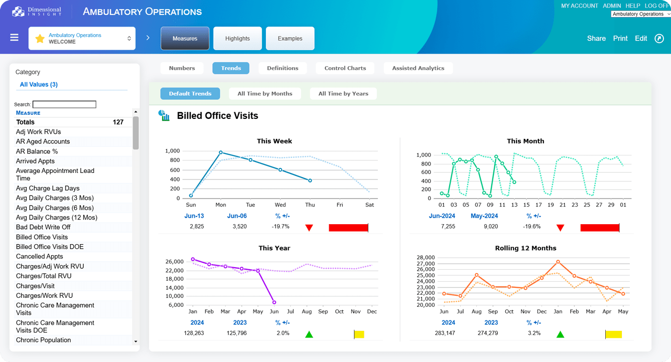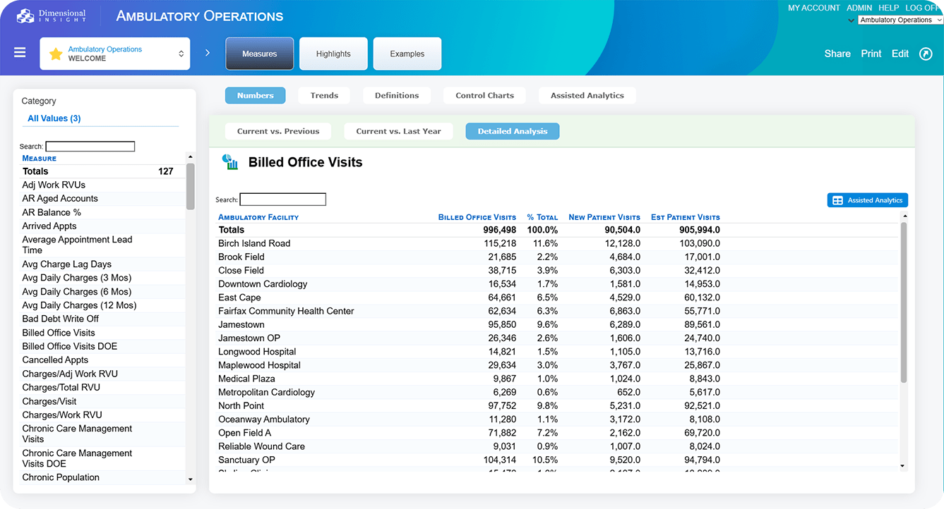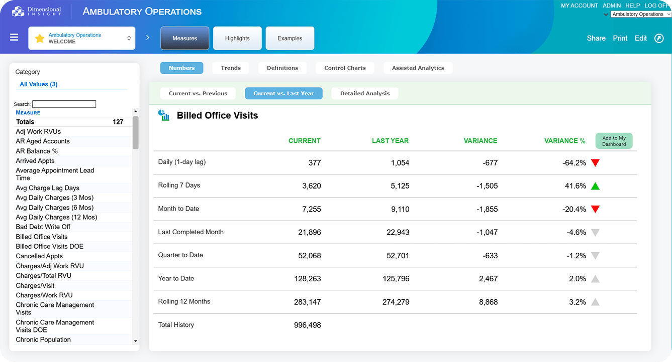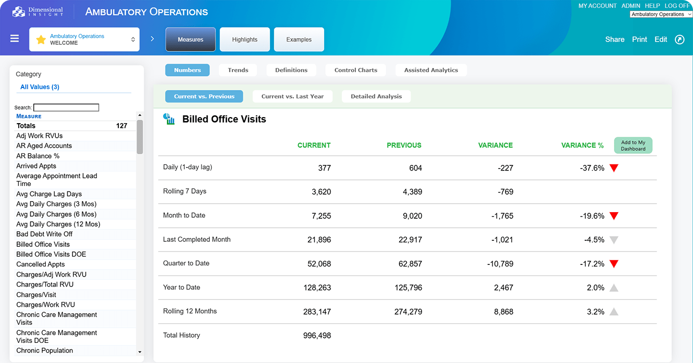 Ambulatory Operations Advisor includes over 125 clinical, financial, and operational metrics.
