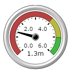 An arc with red, yellow, green performance thresholds and a needle or arrow to indicate in which threshold the value falls. Use gauges when three ranges are needed. For example, unacceptable, acceptable, and exceptional, and you want to use a scale other than the threshold values. |