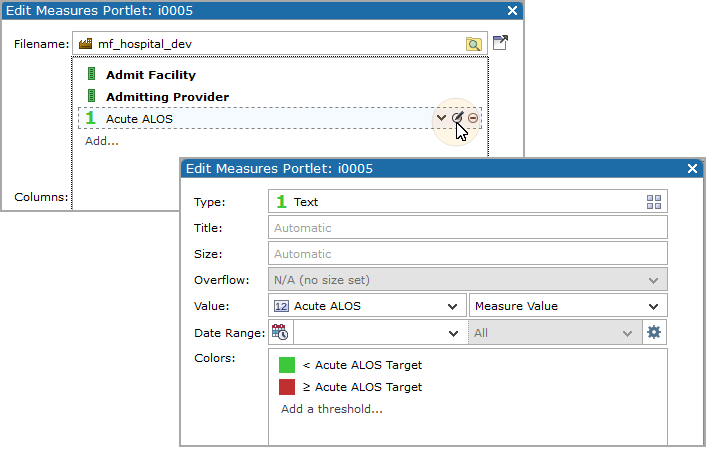 To accomplish this, the administrator used a text column to display Acute ALOS values, and then added an Acute ALOS Target threshold to that column. As a result, the column values are compared with the threshold values: