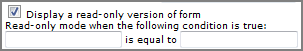 | Display a read only version of form | Prevents the user from submitting data using the form. When the check box is selected, the Read-only mode when the following condition is true definition becomes available. |