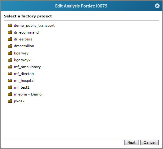 The Edit Analysis Portlet, Select a factory project Closeddialog box opens. This is the first page of a portlet creation wizard.