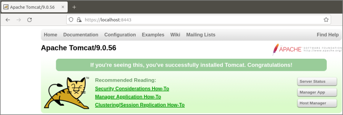 - If you restart the browser and enter https://<servername>:<portnumber>, the default Tomcat home page should display without a security warning.