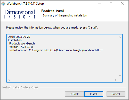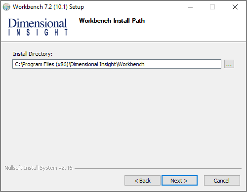 Workbench Install Path page opens and displays the default installation path. For example, C:\Program Files (x86)\Dimensional Insight\Workbench. Make changes if necessary. -