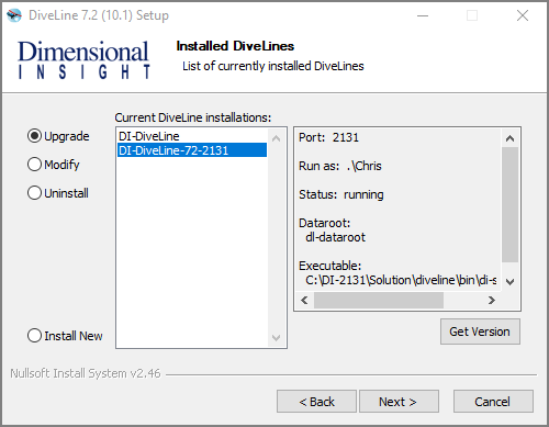 Installed DiveLines page displays. NOTE: This page is called Choose an Action in some Setup Wizards.