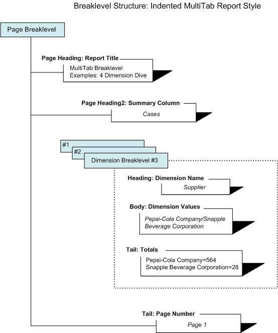 the diagram that follows shows how the breaklevels work in the sample MultiTab Breaklevel Examples: 4 Dimension Dive report using the third indented dimension breaklevel for Supplier.