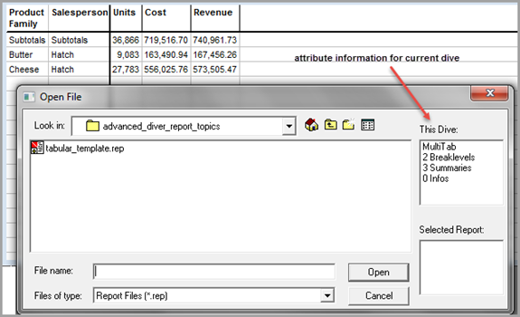 To complete the comparison, select the template file name (tabular_template.rep) in the Open File dialog box to display information about the template report and