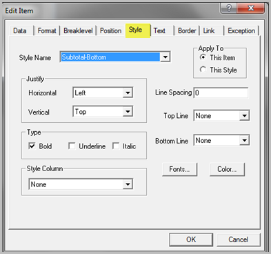 This section enables you to apply any style changes you make to either the report item or the report style option. This Item only changes the style settings for the currently selected items. This Style changes the style settings for the current style and all items that use that style.