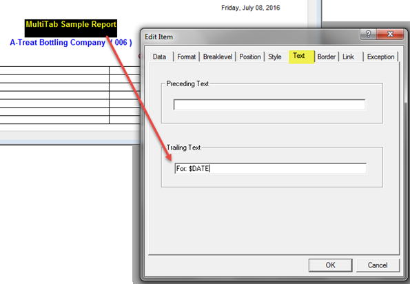 NOTE: For illustration purposes, the opened Text dialog box shows a text variable ($DATE) entered in the Trailing Text box.