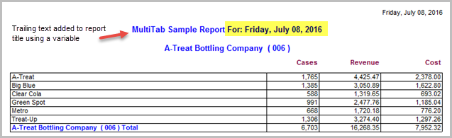example shows the result of adding a date variable to the end of a report title.