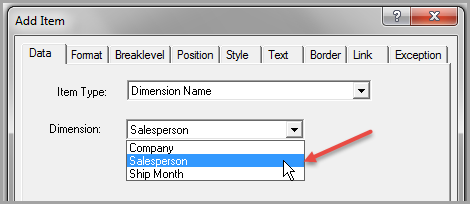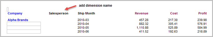 add the dimension name Salesperson to the report.On the report, notice that Salesperson does not share the same text attributes as Company and Ship Month. To edit the position, breaklevel, and style of Salesperson, update the attributes on the following tabs: