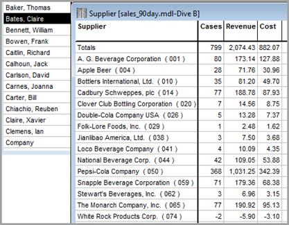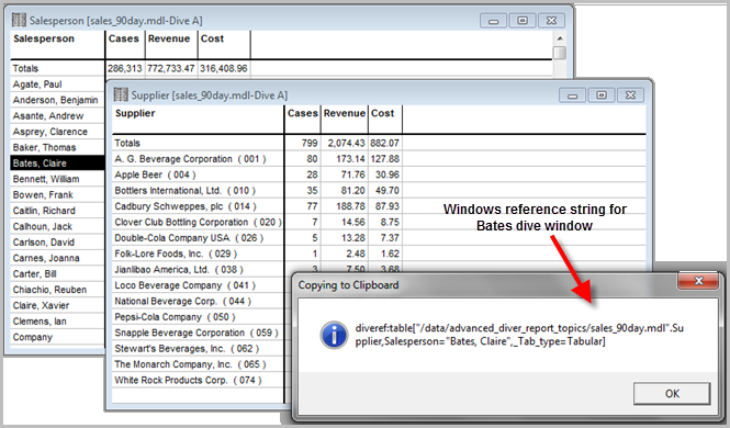 On the Console, double-click Supplier to create a dive window showing Bates' sales for each Supplier. Right-click anywhere on the dive window, and select Copy Window Dive Reference String to