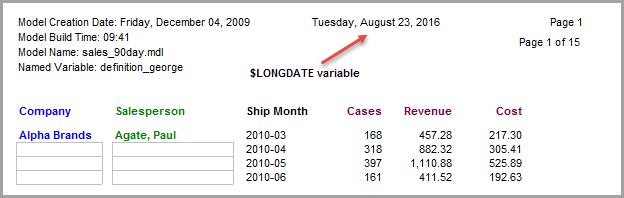 - $LONGDATE — Inserts the current system date, for example, Tuesday, August 23, 2020. This date variable is static and cannot be modified with an argument.