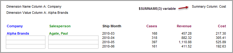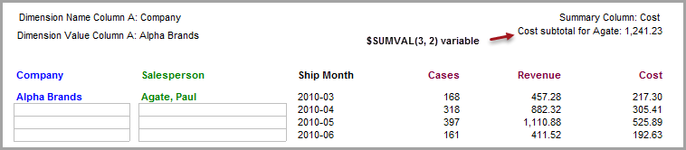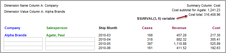 The above example shows that ProDiver, using the $SUMVAL(3,2) variable, would calculate and insert the subtotal value of 1241.23, that is the sum of cost values at the salesperson breaklevel for Paul Agate.
