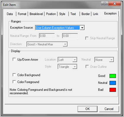 Right-click the Revenue column, and select Edit Item to open the dialog box with the Exception tab.
