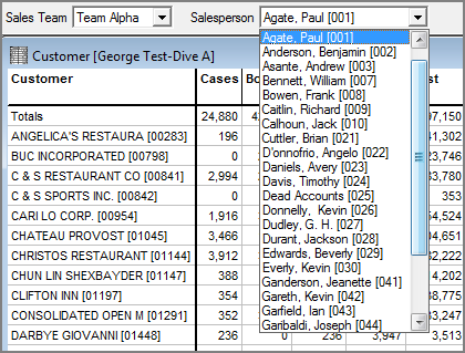 example, each Salesperson is associated with (and therefore a dependent of) a specific Sales Team. The list of names in the Salesperson QuickView is limited to members of the selected Sales Team (Team Alpha). If you select another option from the Sales Team QuickView, the list of names in the Salesperson QuickView is automatically repopulated.