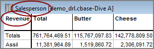 The vertical dimension is indicated by the title of the dive window (Salesperson) and the summary is indicated in the first column heading (Revenue).