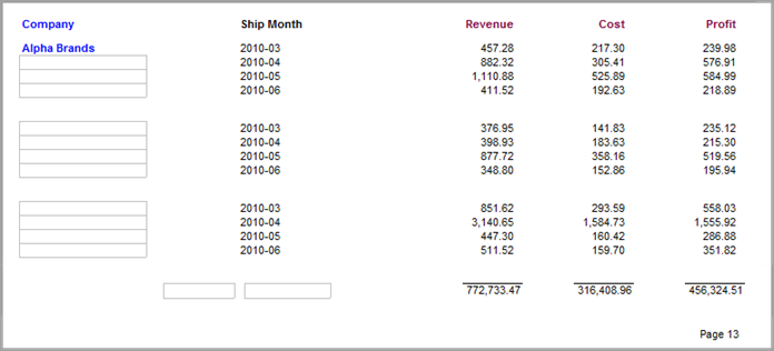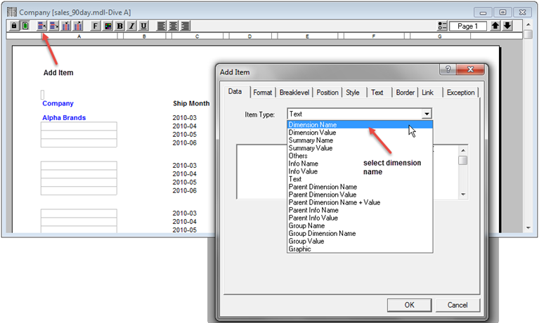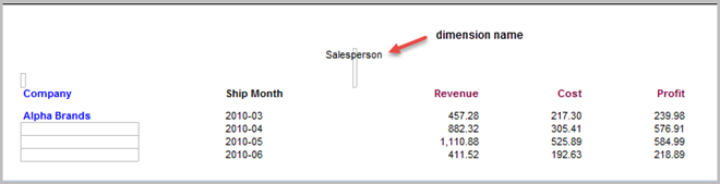 add the dimension name Salesperson to the report.On the report, notice that Salesperson does not share the same text attributes as Company and Ship Month. To edit the position, breaklevel, and style of Salesperson, update the attributes on the following tabs: