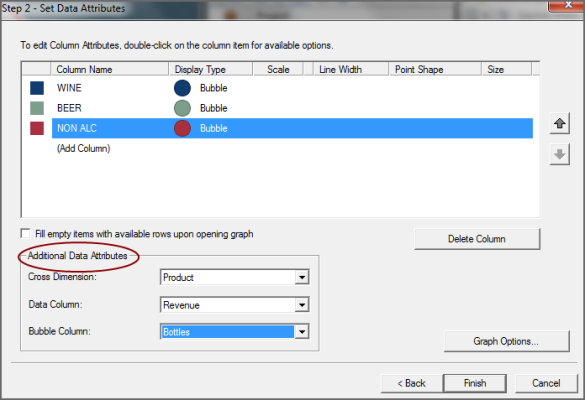 section, select a Cross Dimension and a Data Column from the lists. - If you are generating a Linear Bubble Plot graph, select a Bubble Column. Bubble column data determines the diameter of each bubble.