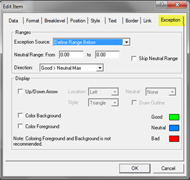 Select Color Foreground to add the appropriate font color (defined for Good, Bad, or Neutral) to the row value font. Note that you must select one or a combination of color display options for exception reporting. Do not select Color Background and Color Foreground at the same time.