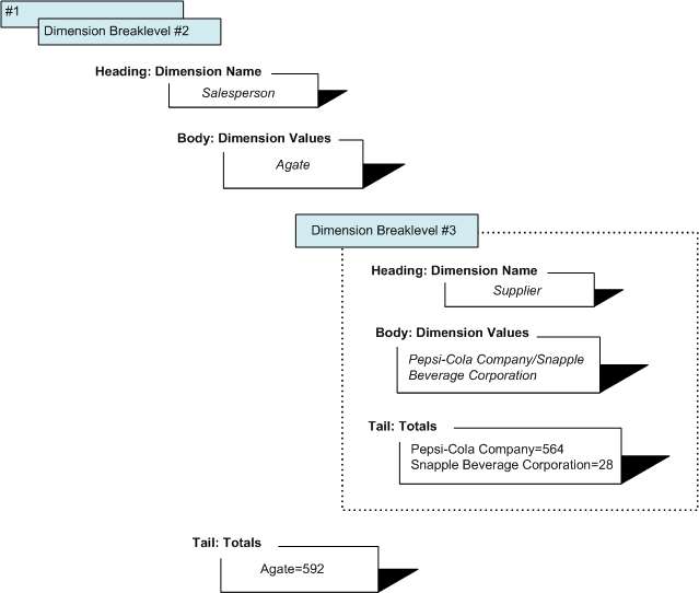 Note that a page breaklevel acts as wrapper for the report content and some of its items, such as summary column headings and page number, that repeat on every page of the report, usually at the top or bottom. The dimension page levels have a Heading, Body, and Tail structure. If you select an indented report style, the dimension breaklevels are nested within one another, starting with the dimension you selected first. In the above diagram, you see the dimension breaklevel and values for Supplier, the third dimension selected in the sample dive window.