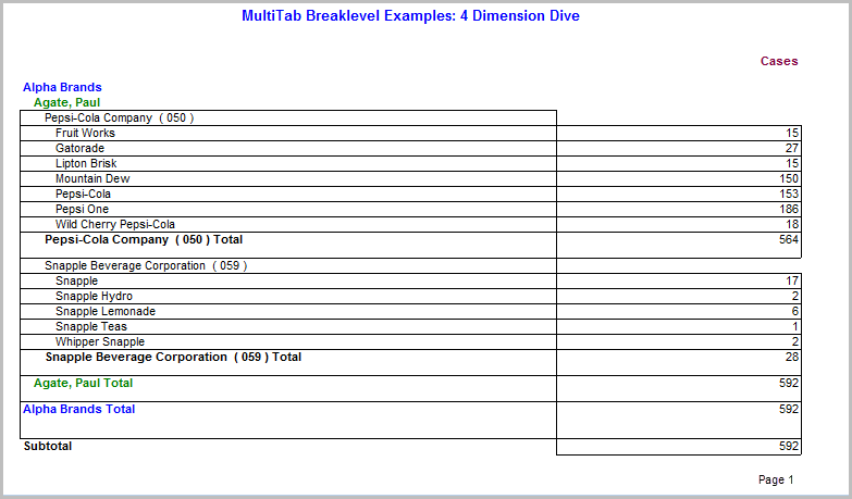 the diagram that follows shows how the breaklevels work in the sample MultiTab Breaklevel Examples: 4 Dimension Dive report using the third indented dimension breaklevel for Supplier.