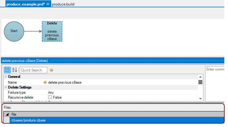4. Set the file to be deleted in the Files section of the Delete node attributes pane. See Delete Process Node for more information about the other Delete node attributes.