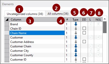 headings in the Elements pane provide information about a column and enable you to view information and perform the different actions as numbered.