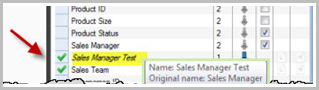 arrow in the following figure points to an dimension name in italic type, which indicates that the name is an alias. If you hover over Sales Manager Test, DiveMaster displays a popup showing the current dimension name and the original dimension name (Sales Manager).