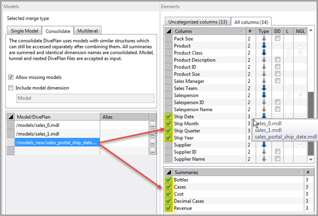 Note that the green check marks next to the columns and summaries in the Elements section indicate that these columns appear in the sales_portal_ship_date.mdl model. Additionally, the value (3) in the # column indicates that Ship Date, Ship Month, Ship Quarter, Ship Year and all the summary columns also appear in the other two models in the DivePlan.