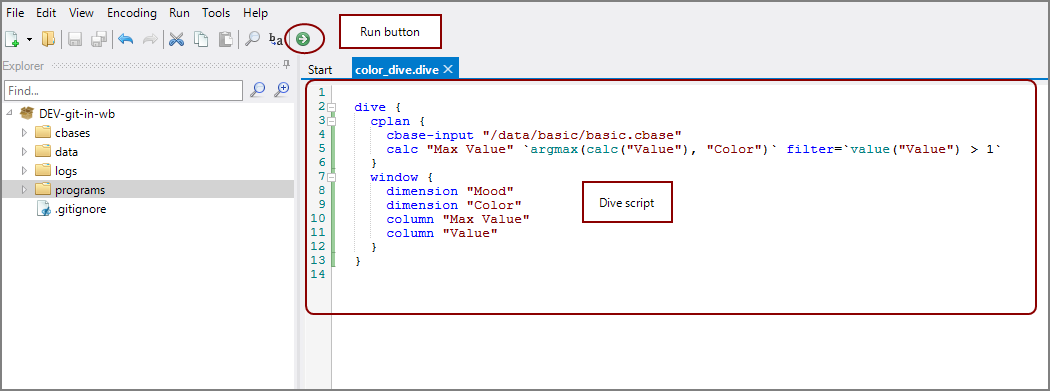 On the toolbar, click the green arrow to run the Dive script.