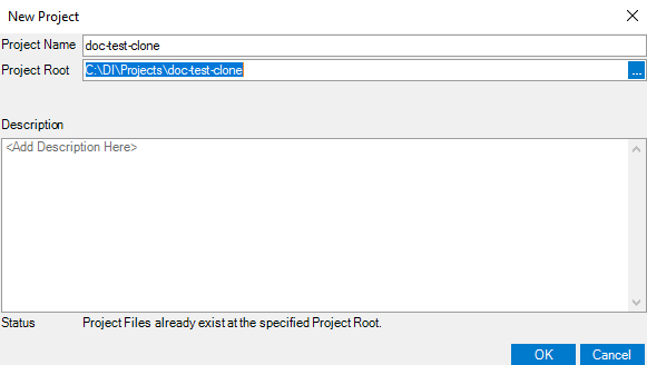2. In the Project Root box, edit the path to be the file path of the Workbench project you want to import. The Project Name automatically fills in as the name of the Workbench project you selected and the ClosedStatus becomes Project Files already exists at the specified Project Root. You may change the project name.