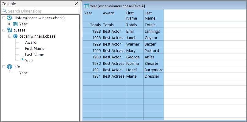 Any columns not referenced by the rotate operation appear as the left-most columns. In this example, that is the Year column. Next, are the columns that are part of the rotate operation, listed in the order they are referenced in the rotate operation. In this example, those columns are Award, followed by First Name and Last Name. The output is sorted by Year, due to it being the first column in the output.