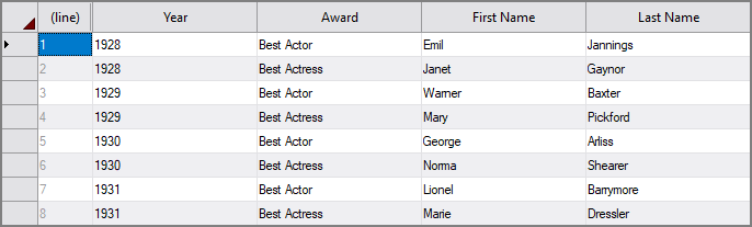 Each row contains distinct items. One column describes all the items on the row (Year). On each row, Actor First and Actor Last represent the Best Actor winner, while Actress First and Actress Last represent the Best Actress winner.