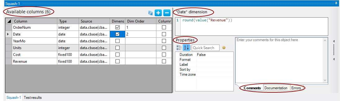Each dimension in a squash object is calculated before its values are combined. The Expressions Editor pane allows you to define calculations for each dimension or column. The syntax for the Expressions Editor pane is the same as in the Spectre Build Calc Object and all functions can be found in the list of Alphabetized Functions for Spectre