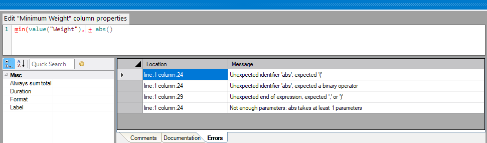 Errors tab displays any formatting errors that occur in the Dimension Properties pane. These can include missing parentheses, incorrect data types in parameters, or missing or excessive parameters.