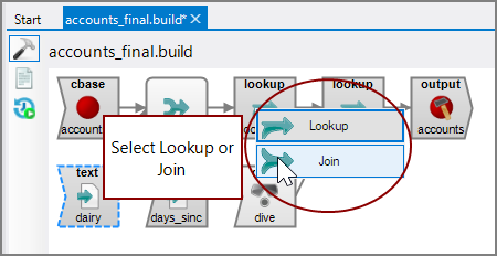 If you drag the file and drop it on a specific node, you will be given the choice of adding it as a Lookup or as a Join object.