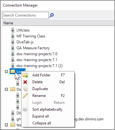 - Sort alphabetically—Reorders the connections within the folder alphabetically.
