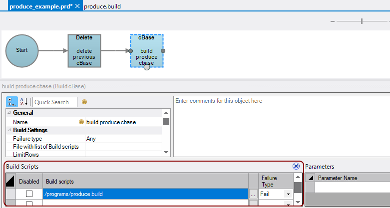 6. Set the Build file to use for this build in the Build Scripts section of the Build cBase attributes pane. In this example the Build file outputs to a staging folder. See Build cBase Process Node for more information about the other Build cBase node attributes.