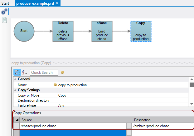 8. Set the file in the staging folder to be copied (in this example it is the output cBase of the Build script called in the Build cBase node) as the Source in the Copy Operations section of the Copy node attributes pane. Set a cBase folder as the Destination. See Copy Process Node for more information about the other Copy node attributes.