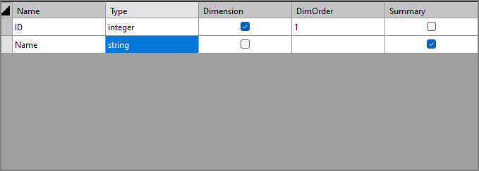 | DimOrder | Sets the dimension order. This field populates automatically with a number reflecting the order in which you have specified the column as a dimension column. You can change the order value manually by double-clicking on this attribute. |