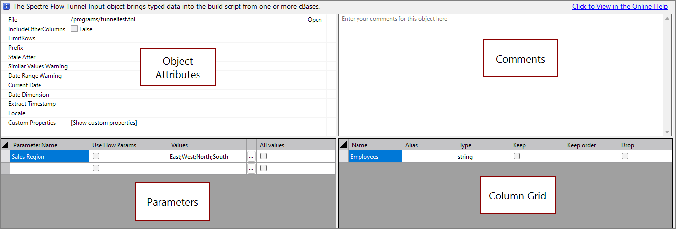 The Spectre Flow Tunnel Input object brings typed data into the build script from a VI Tunnel script.