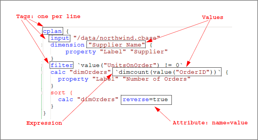 - Tags and elements are organized into blocks of code using braces ({ }).